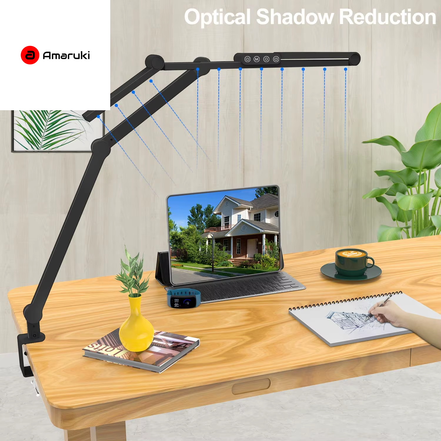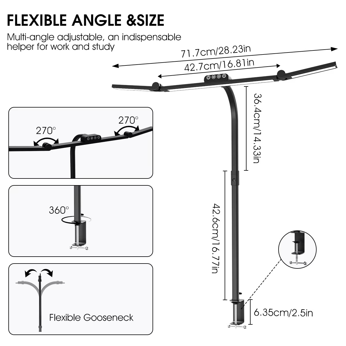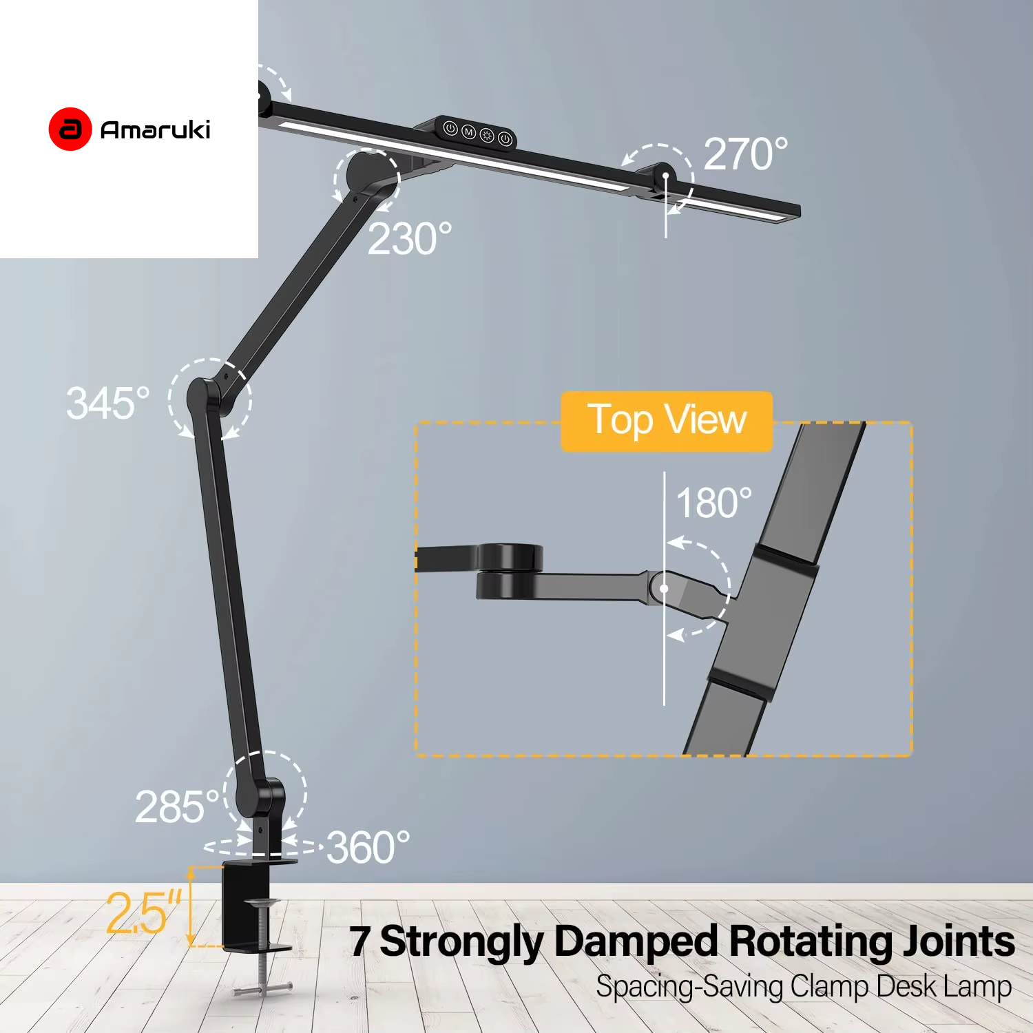 our swing arms led desk light features 7 strongly damped joints with 3 ultra bright light bars design for freely vertical adjustment and horizontal adjustment. You can rotate the bilateral light bars vertically to change the illumination angle. Turn them up to expand the lighting coverage to illuminates your entire desk or turn them down to create a super bright lighting area for sewing crafting. You can also rotate the base to adjust the light direction and position.
