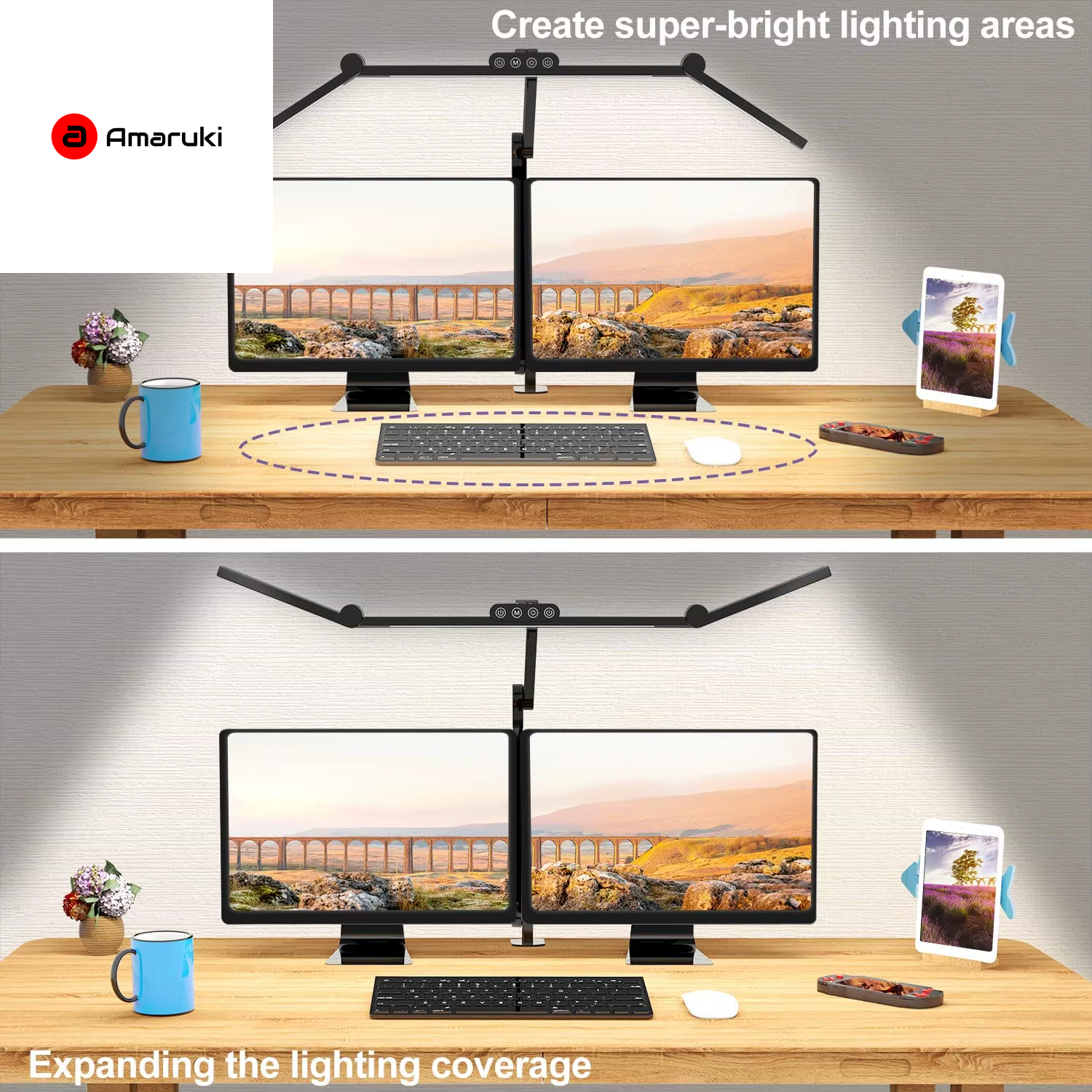 This 24W table lamp is equipped with high color rendering index LEDs(CRI>90) to generate soft flicker-free and anti-glare light and accurately render colors, close to the natural light and less blue light hazard. You won't get tired with prolonged use. You can also rotate the left auxiliary light down for eliminating shadows.