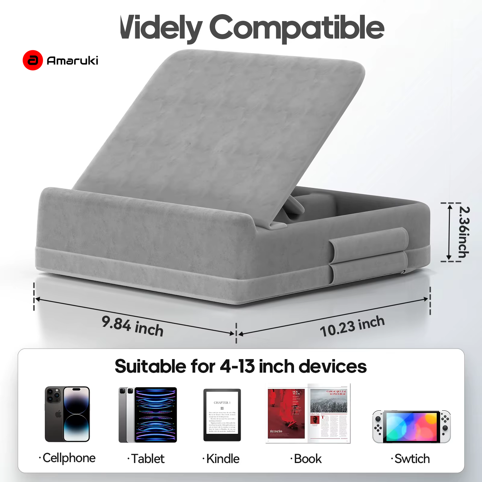 Universal Compatibility -The pillow tablet stand is compatible with 4.7‘-13’ tablets, mobile phones, Like 2024 iPad Pro 13 inch/ 2022/ 2021 iPad Pro 11/ 12.9, 2024 iPad Air, iPad 10.9, iPad Air 6/ 5, iPad Mini 6/ 5/ 4/ 3, iPad Pro 9.7/ 10.5, iPad 5th/ 6th/ 7th/ 8th/ 9th/ 10th generation, Kindle Fire HD 7 8 10, E-reader,iPhone 16 Pro Max, iPhone 15 Pro Max, 14 13 12 11 Pro Max, Surface Pro, Switch., books and more.