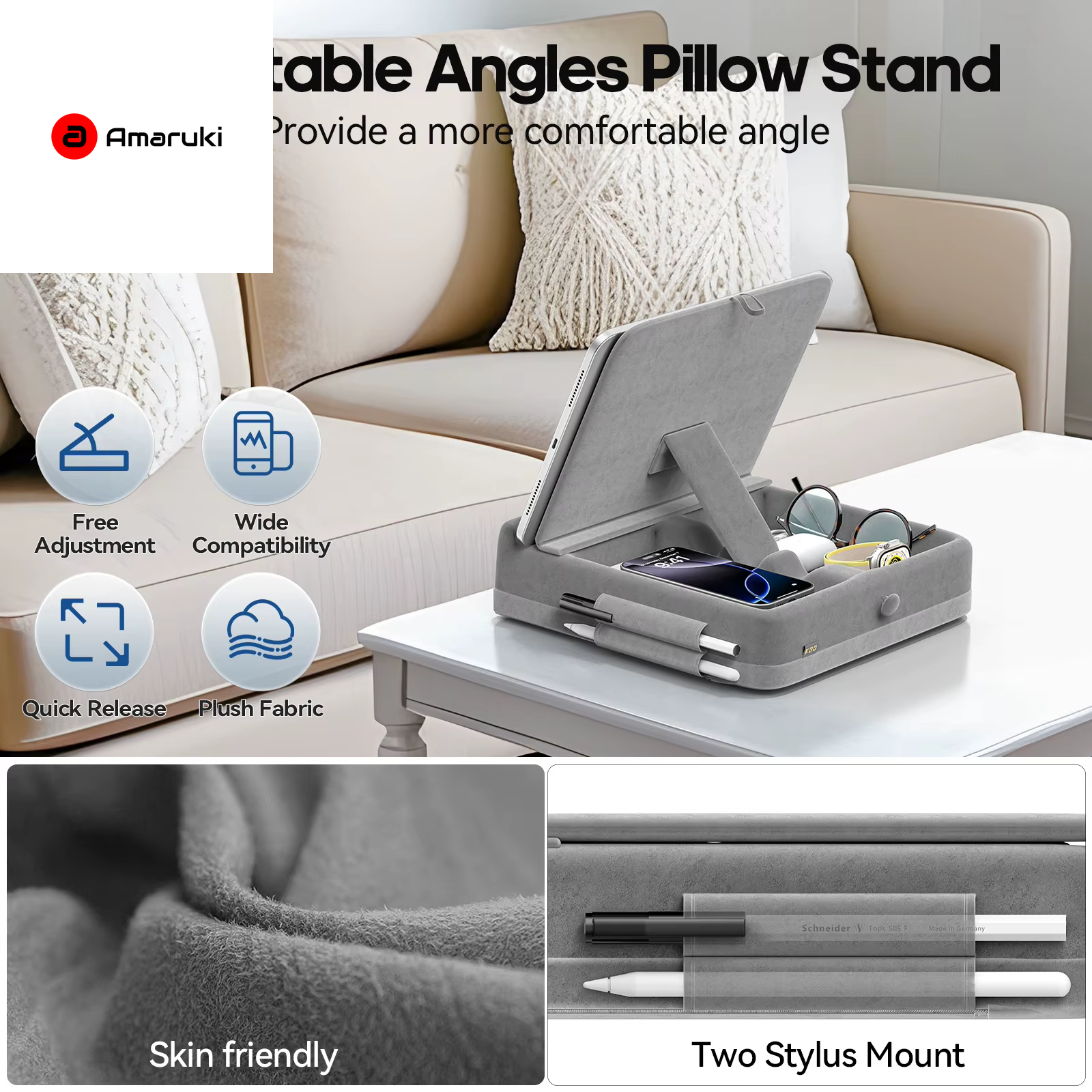 Tablet Pillow Stand with Storage Foldable Ipad Holder for Bed & Lap and Desk Angle Adjustable Soft Pad Dock with Stylus Mount