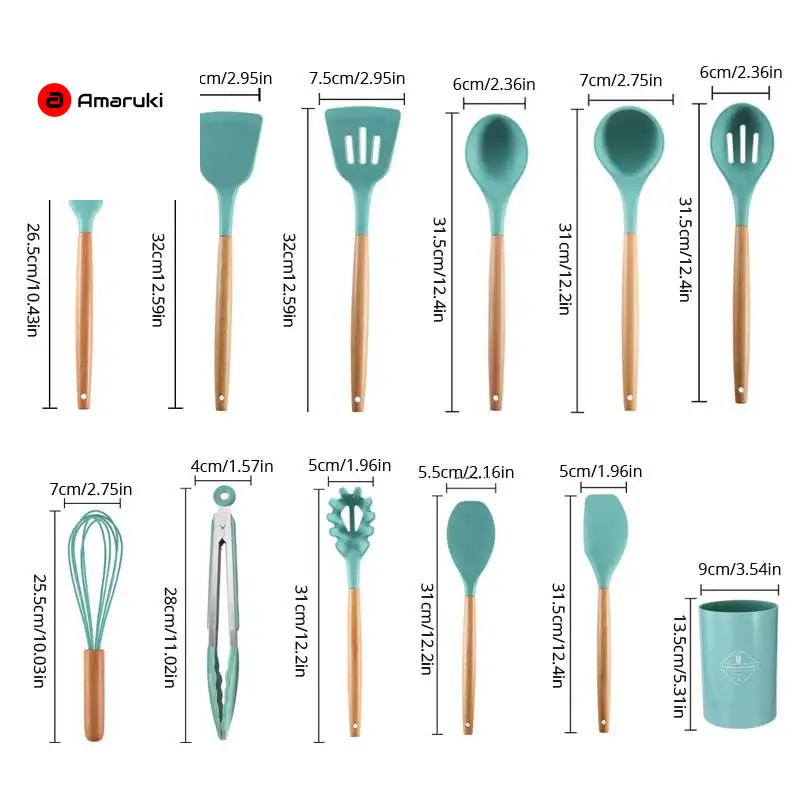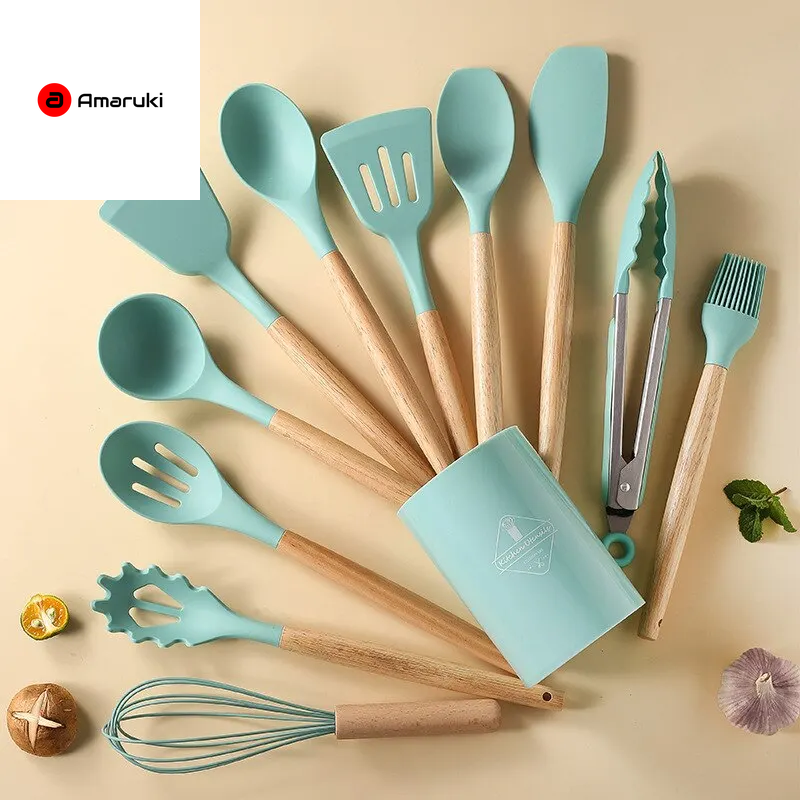 12-Piece Wooden Handle Silicone Kitchen Utensil Set with Storage Bucket