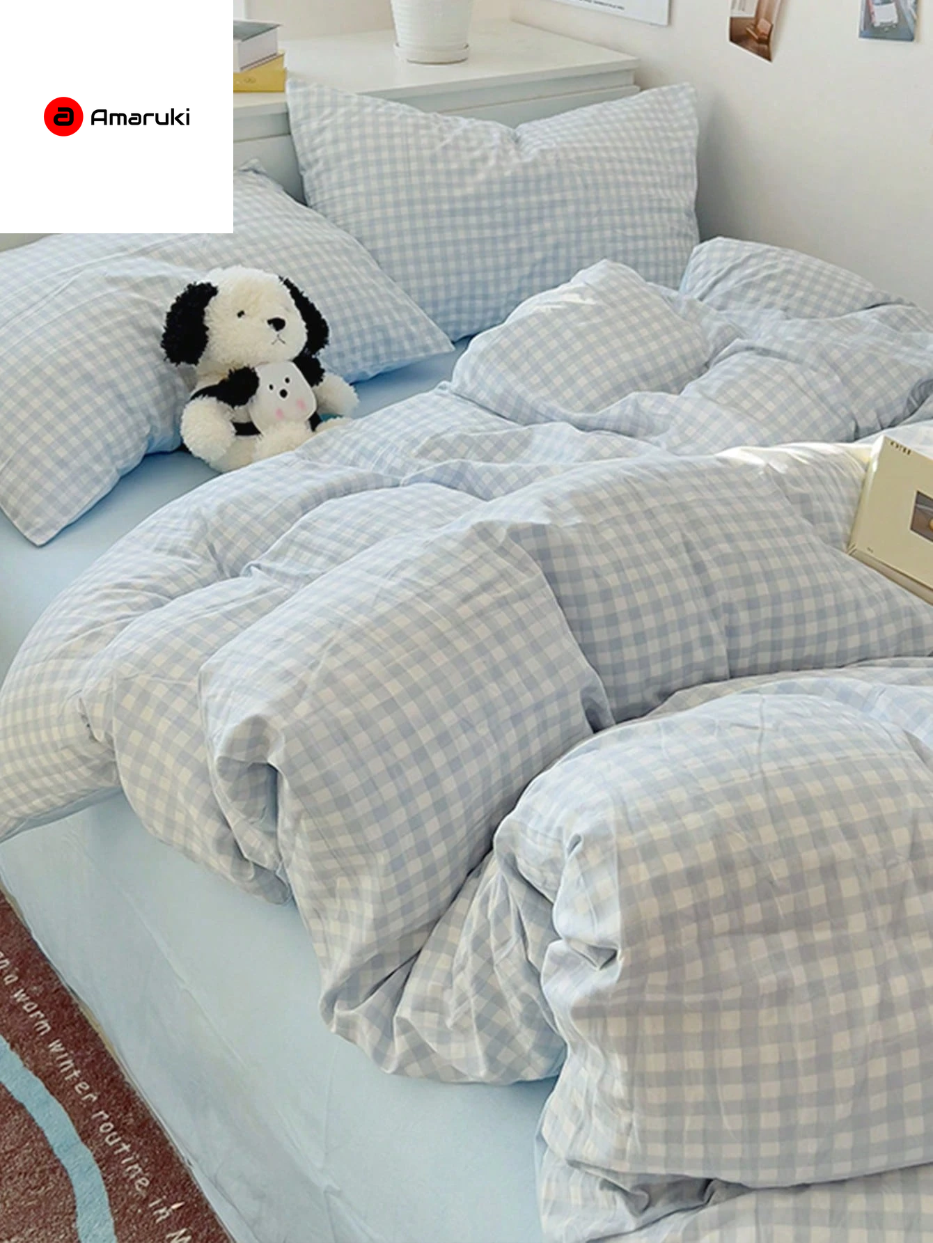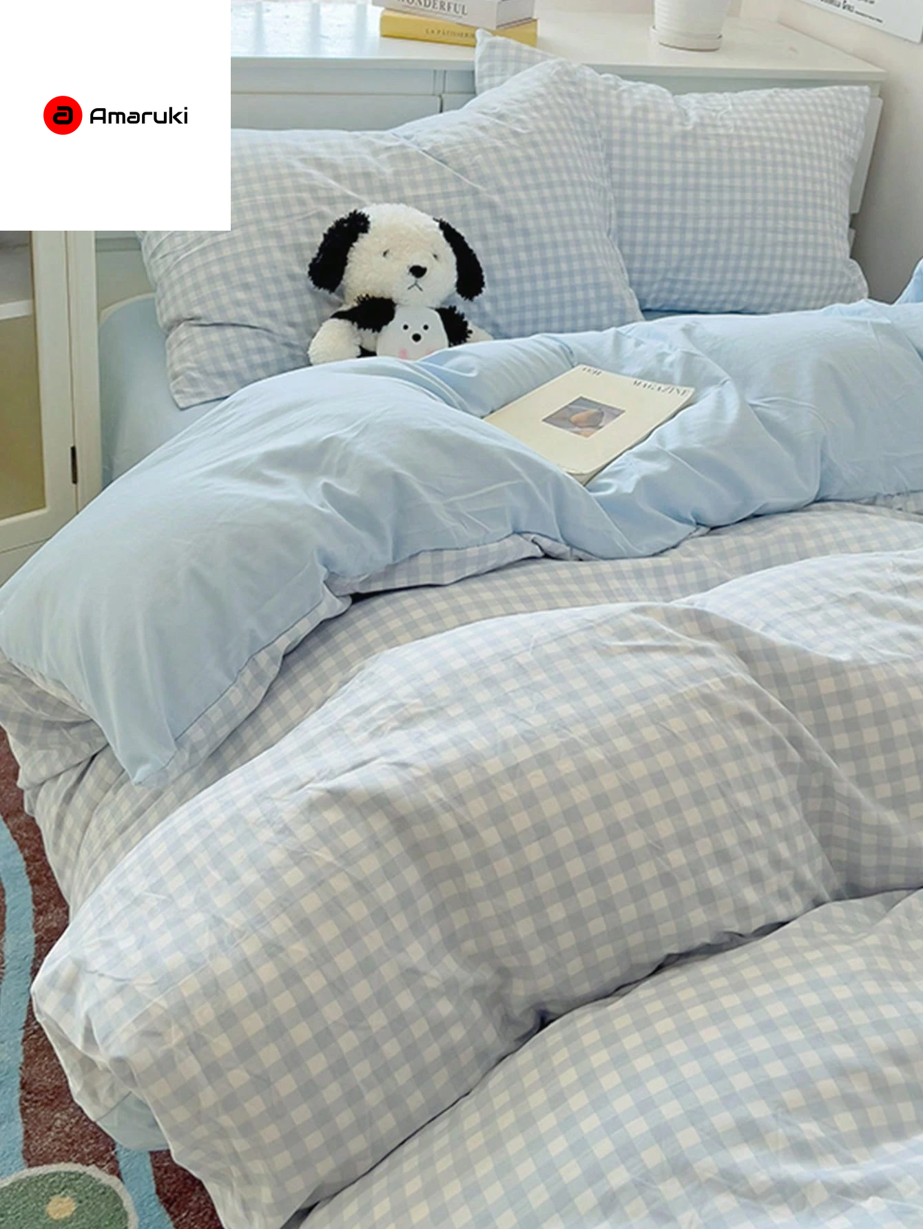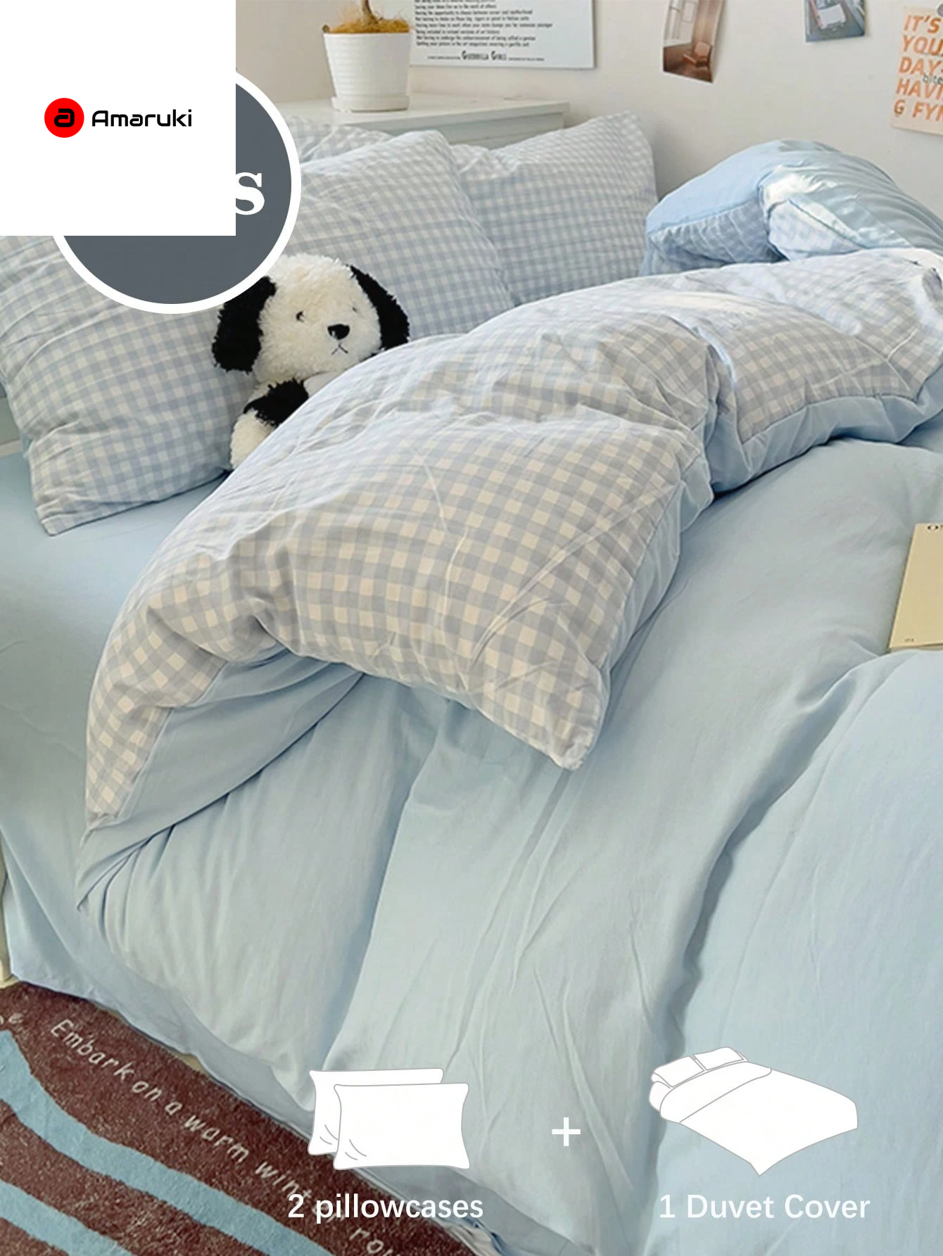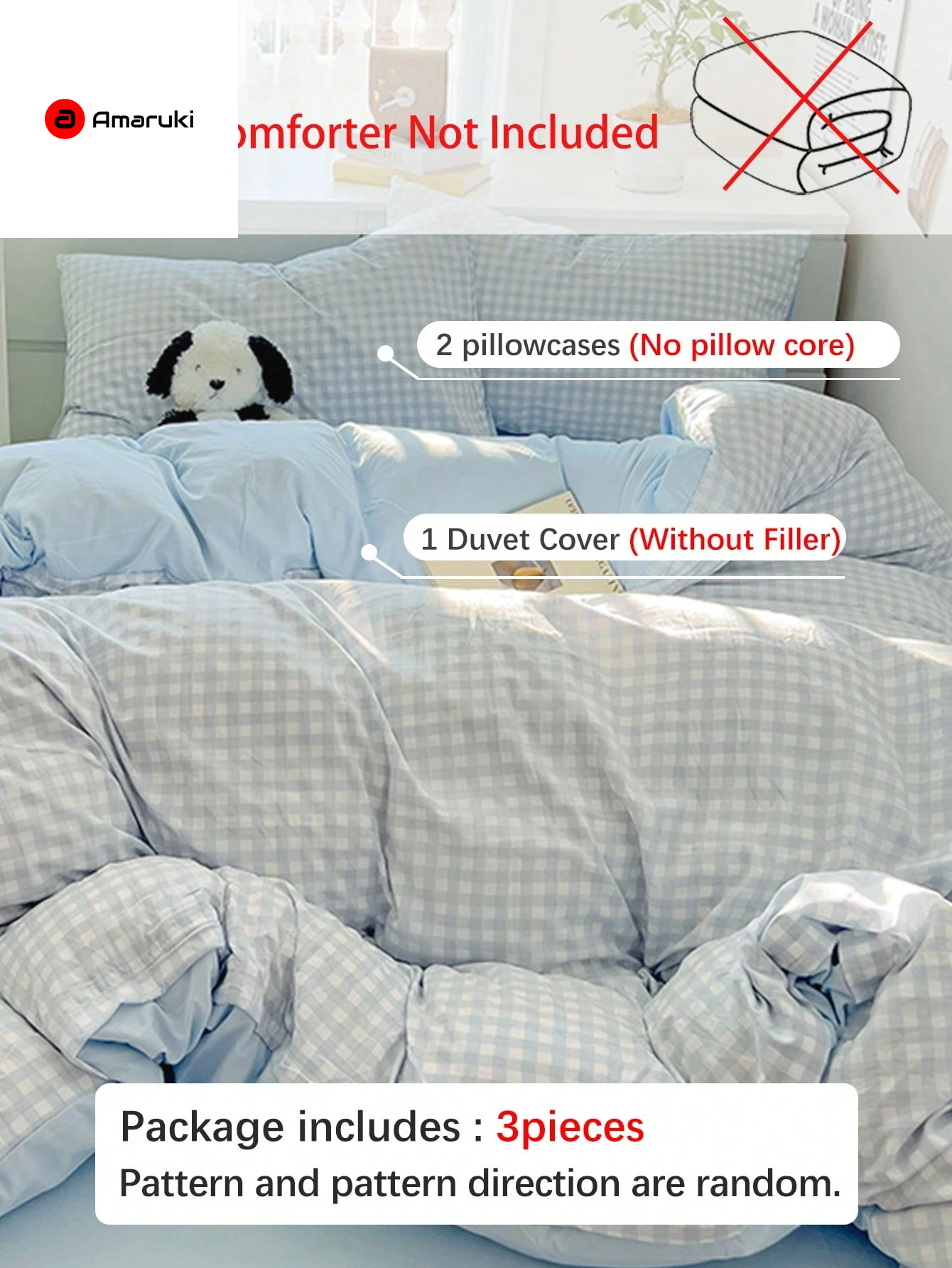3Pcs, Sky Blue, Small and Fresh,Plaid,Girls,School Students, Small Fresh, Super Soft, Lovely, Four Seasons, Boys and Girls,Dormitory Dress-Upsanding Quilt Cover, Home Bedding, Kit, excluding Quilt Core,Twin Queen King
